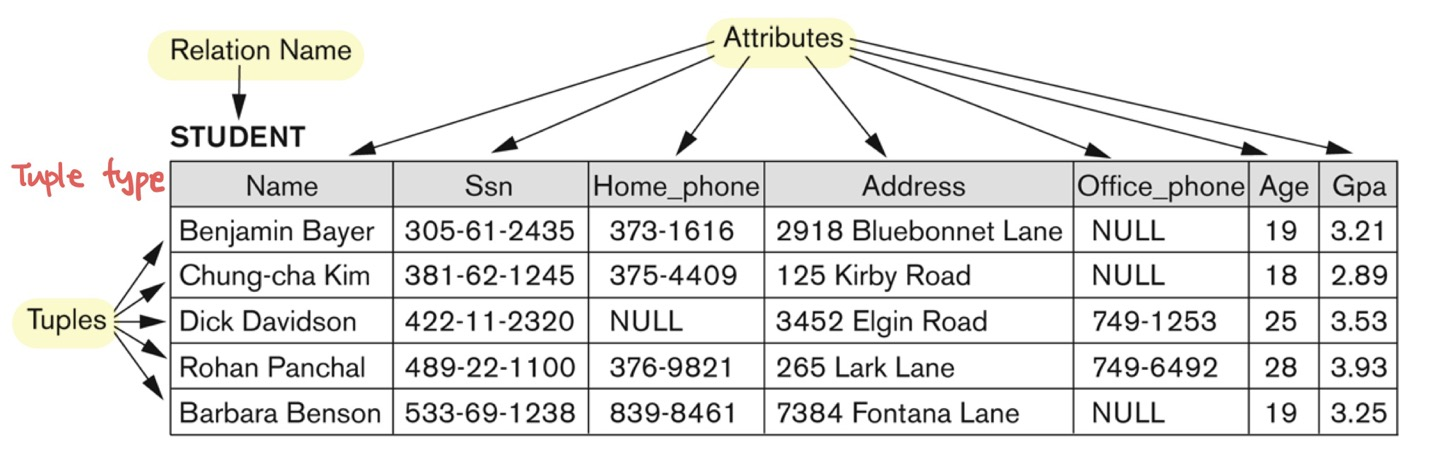 Relation은 table처럼 보인다. 각 row 줄을 tuple이라고 한다. Entity와 같은 개념이라고 보면 된다. Tuple이 가지는 attributes 중 유니크하게 구별해주는 attribute를 key라고 한다. 위의 예시에서는 SSN이 Key가 된다.