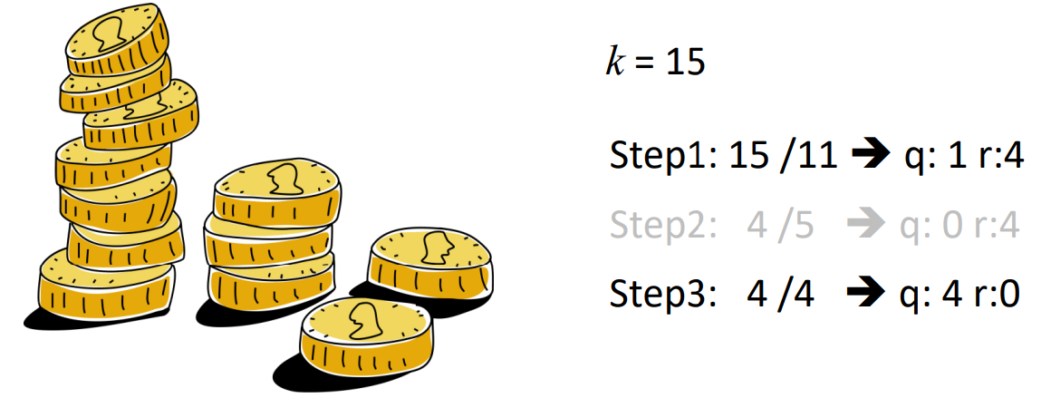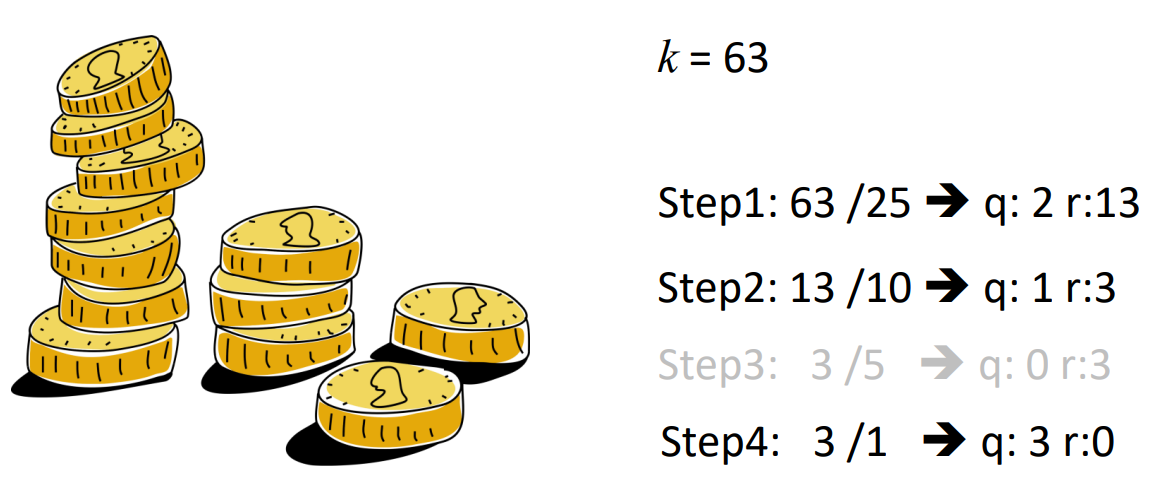 우리에게 k 코인이 있을 때, 최대한 적은 수의 코인으로 교환해 준다고 생각해 봅시다. [quarter(25c), dime(10c), nickel(5c), penny(1c)]