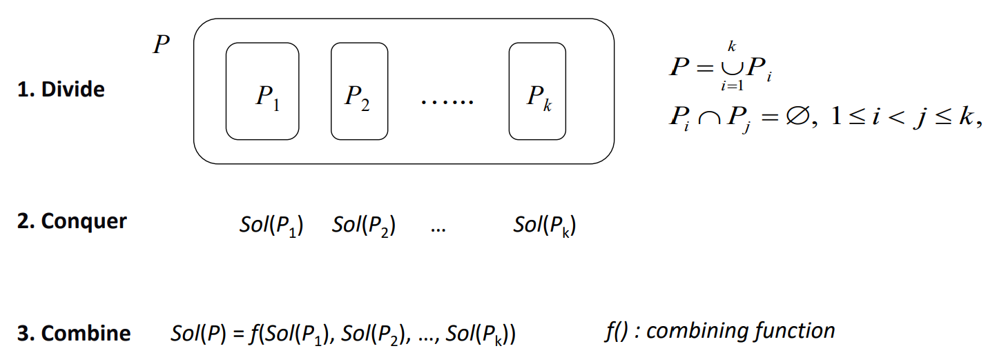 문제를 Subproblem으로 나누고 subproblem을 해결함으로써 문제를 해결하는 방법입니다. 문제를 나누는 일은 자기 마음대로 하면 됩니다. 대표적인 예시로는 Merge sort나 Binary search 등이 있습니다.